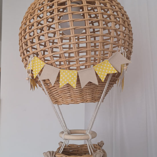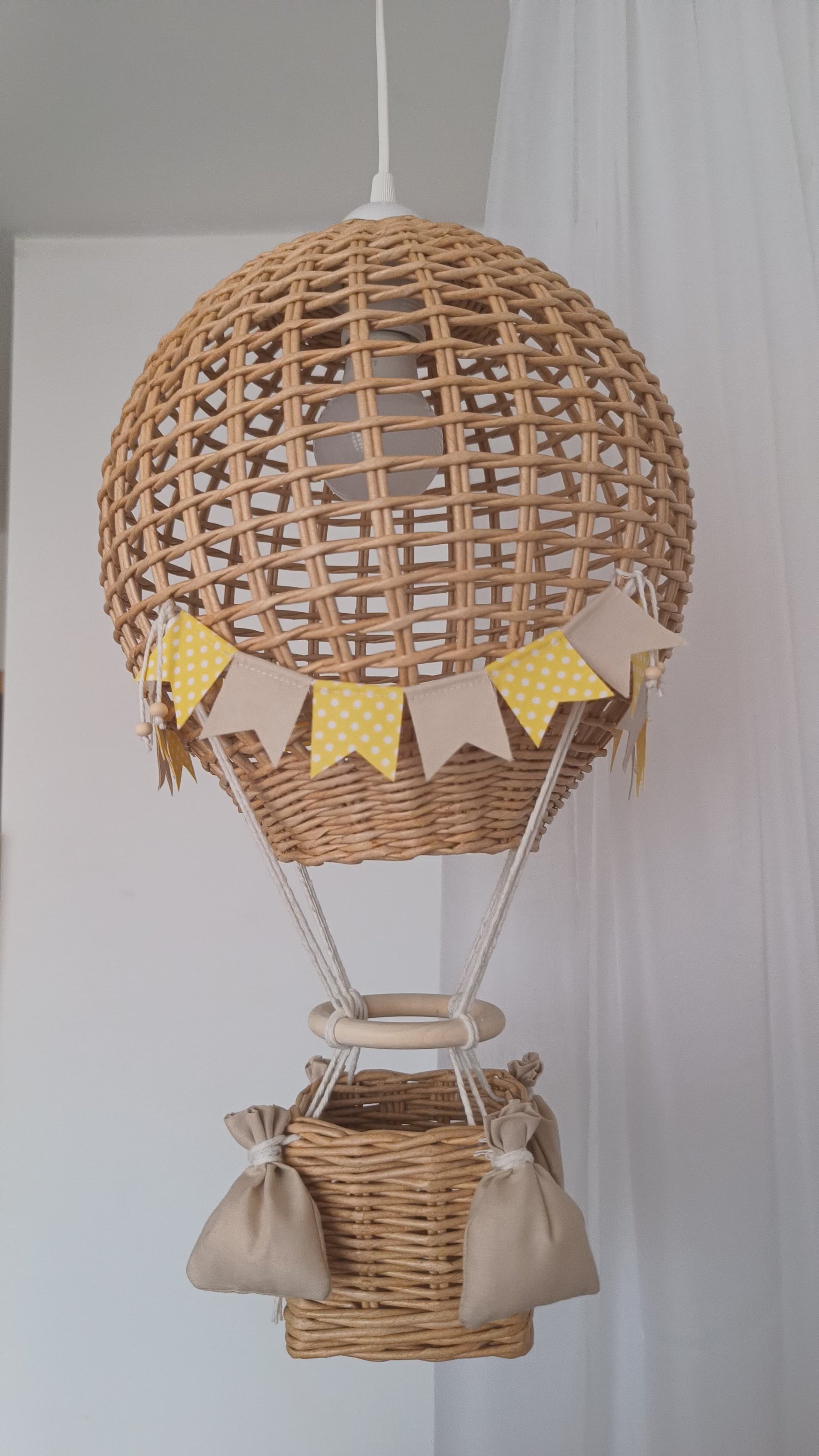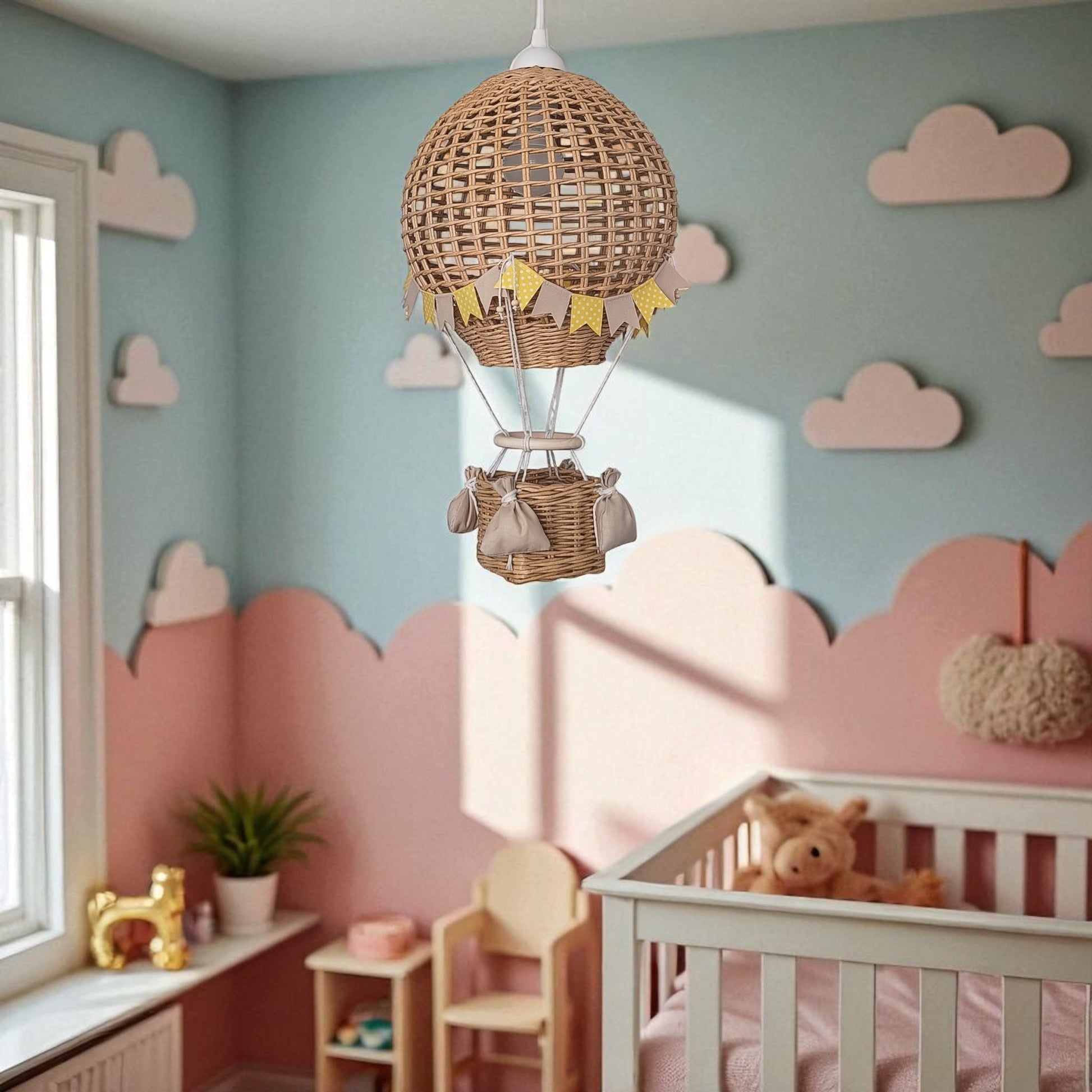 Lampa sufitowa „Balon” to urocza dekoracja, która wprowadza do pokoju dziecka ciepło, lekkość i bajkowy nastrój. Abażur w kształcie unoszącego się balonu z koszykiem, ozdobiony bawełnianymi detalami, doskonale komponuje się z wnętrzami w stylu boho, skandynawskim lub naturalnym.
