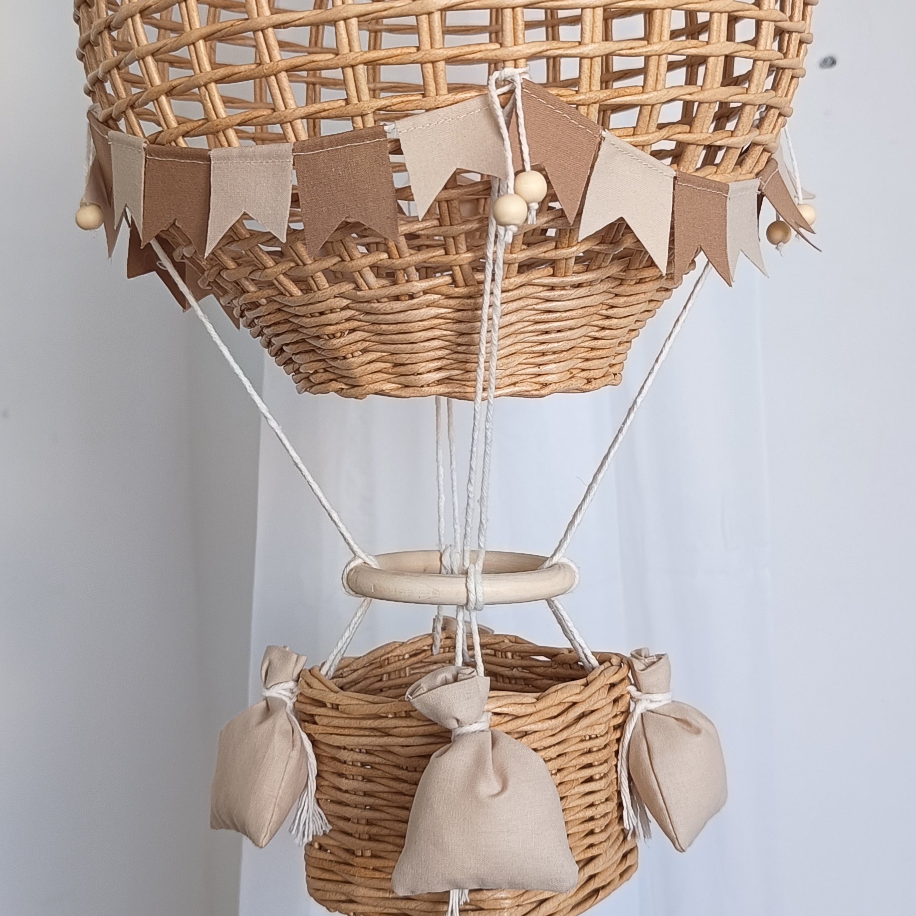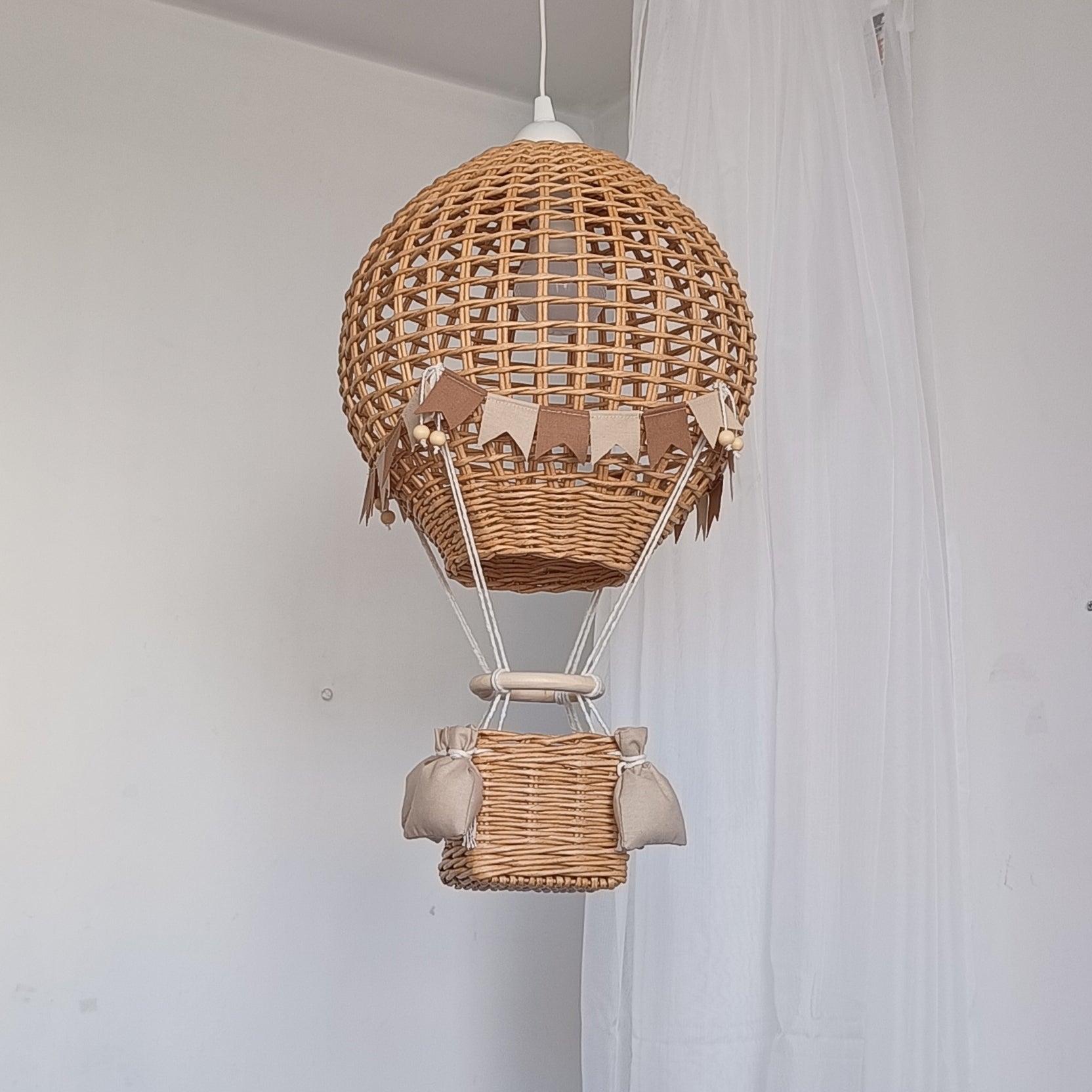 Lampa sufitowa „Balon” to urocza dekoracja, która wprowadza do pokoju dziecka ciepło, lekkość i bajkowy nastrój. Abażur w kształcie latającego balona z koszykiem, ozdobiony bawełnianymi detalami, doskonale komponuje się z wnętrzami w stylu boho, skandynawskim lub naturalnym.