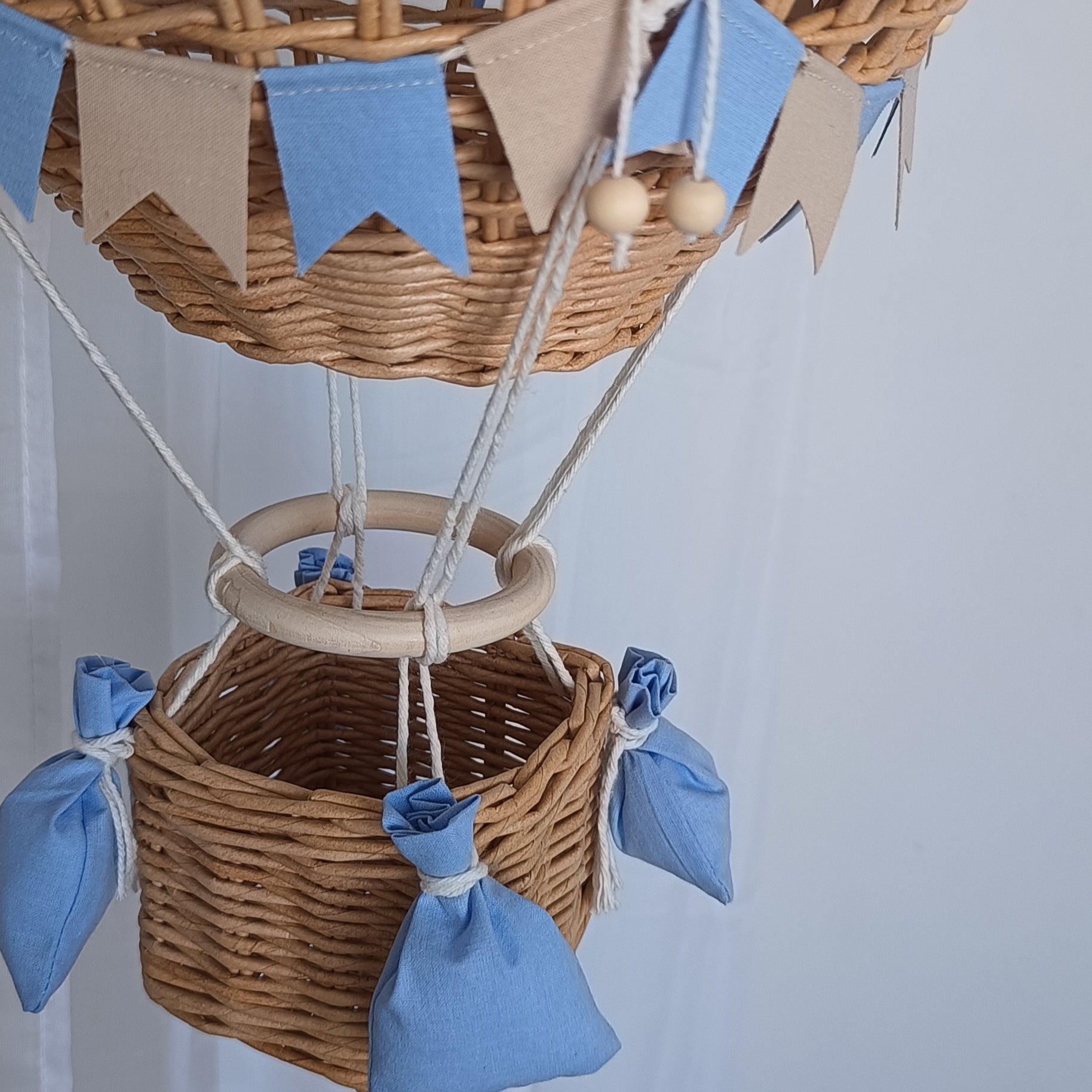 Lampa sufitowa „Balon” to urocza dekoracja, która wprowadza do pokoju dziecka ciepło, lekkość i bajkowy nastrój. Abażur w kształcie unoszącego się balonu z koszykiem, ozdobiony bawełnianymi detalami, doskonale komponuje się z wnętrzami w stylu boho, skandynawskim lub naturalnym.